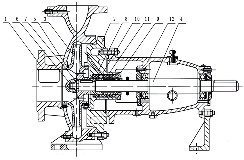 1 泵體 2 泵蓋 3 葉輪 4 軸 5 密封環(huán) 6 葉輪螺母 7 止動(dòng)墊圈 8 軸套 9 填料壓蓋 10 填料環(huán) 11 填料 12 懸架軸承部件